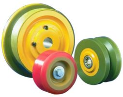 由钢/铸铁轮毂和vulkollan bayer 92sha / vulkotech 92sha涂层制成。车轮的结构和涂层的选型和计算,必须考虑能力(处理载荷+小车重量),工作速度(m /秒),加速度,减速,制动,负载分配(轴上或悬臂上),每天的工作时间和工作温度(°c)为这些特殊应用的车轮是根据客户的设计,谁可以使用我们的技术服务的设计。
